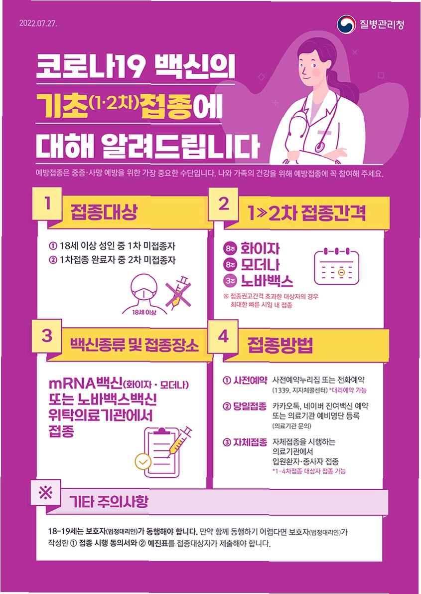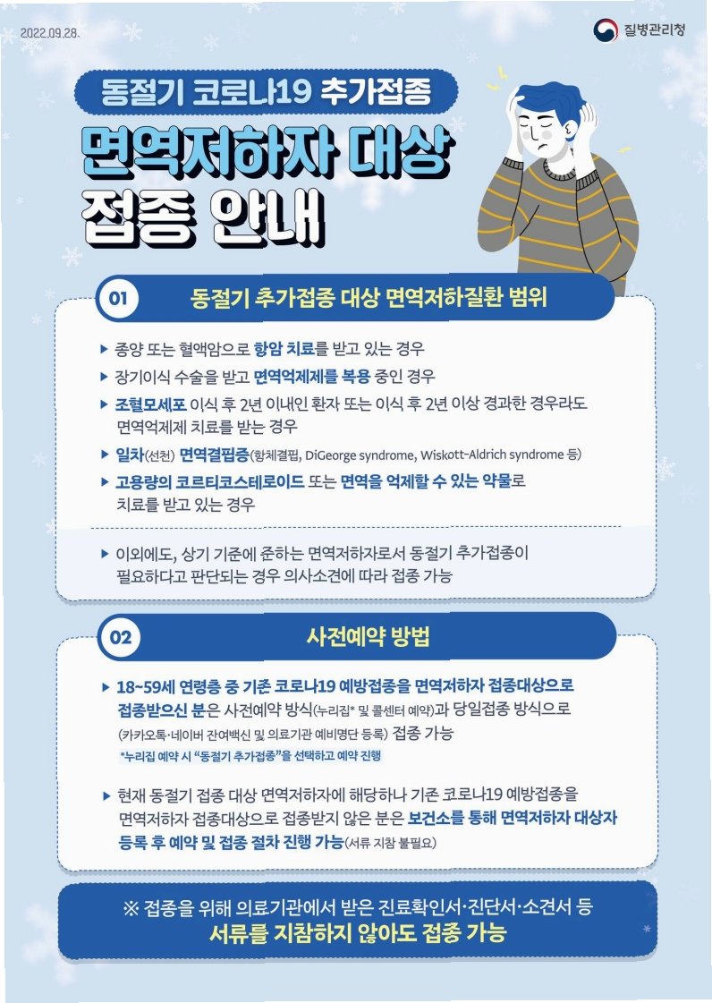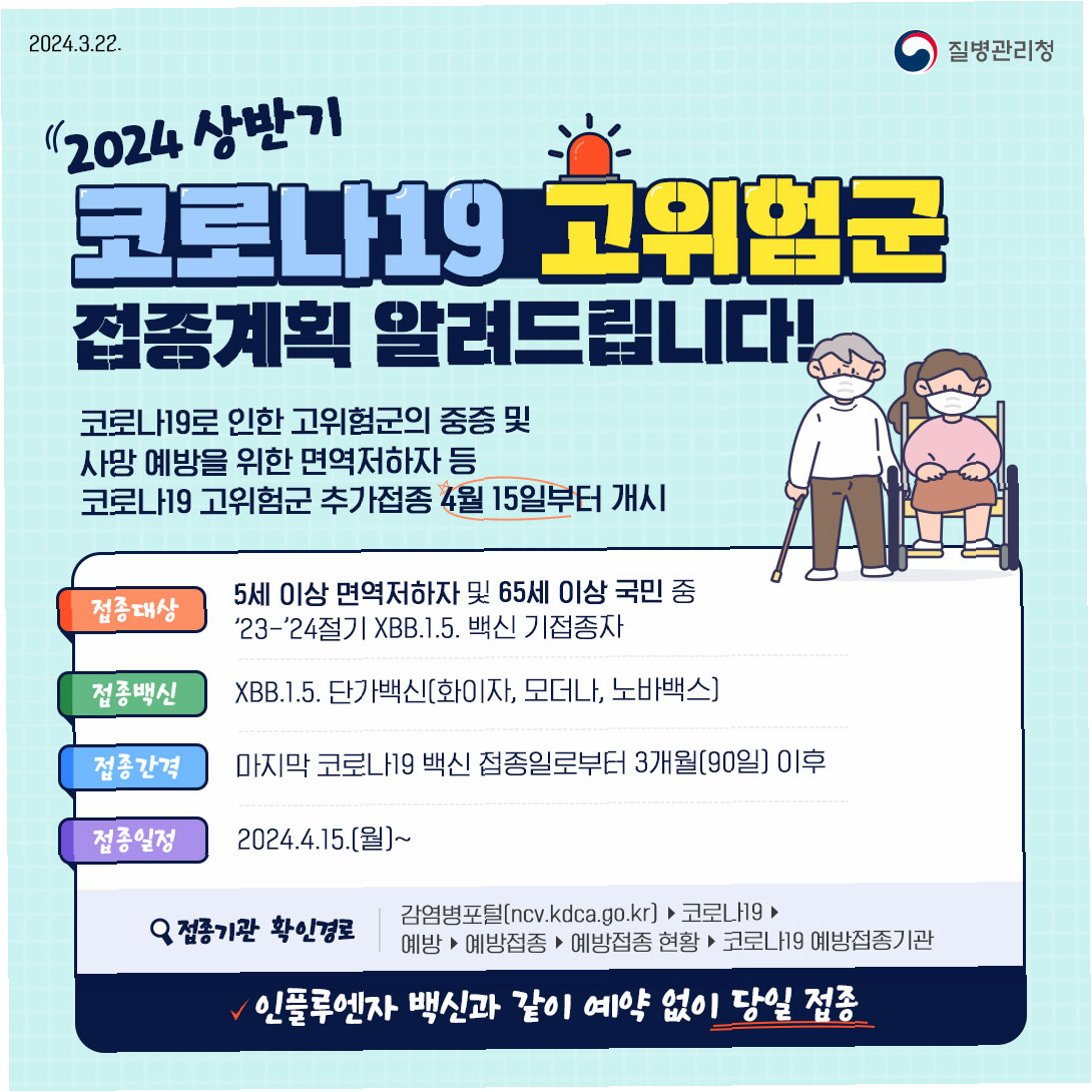 코로나19가 인접 국가에서 재확산되고 있는 가운데, 우리나라 방역당국은 고위험군의 예방접종을 강력히 권장하고 있습니다. 개인의 건강과 사회의 안전을 위해, 미리 예방접종을 완료하는 것이 중요합니다.