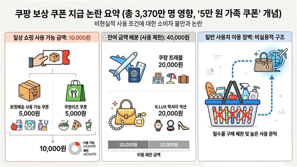 소비자들은 쿠팡의 보상안에 대해 실망감을 드러냈습니다. 5만 원 규모의 이용권을 제공한다고 했지만, 쿠팡과 쿠팡 이츠에는 5천 원씩, 1만 원만 배정해 '꼼수 논란'에 휩싸였습니다. 석 달 내에 사용해야 하고, 5천 원 이용권의 경우 쓰고 남은 금액은 돌려받지 못하는 등 제한적인 조건이 붙었습니다. 쿠팡 트래블 역시 사용처를 고가 상품으로 제한하여 소비자들의 불만을 샀습니다.