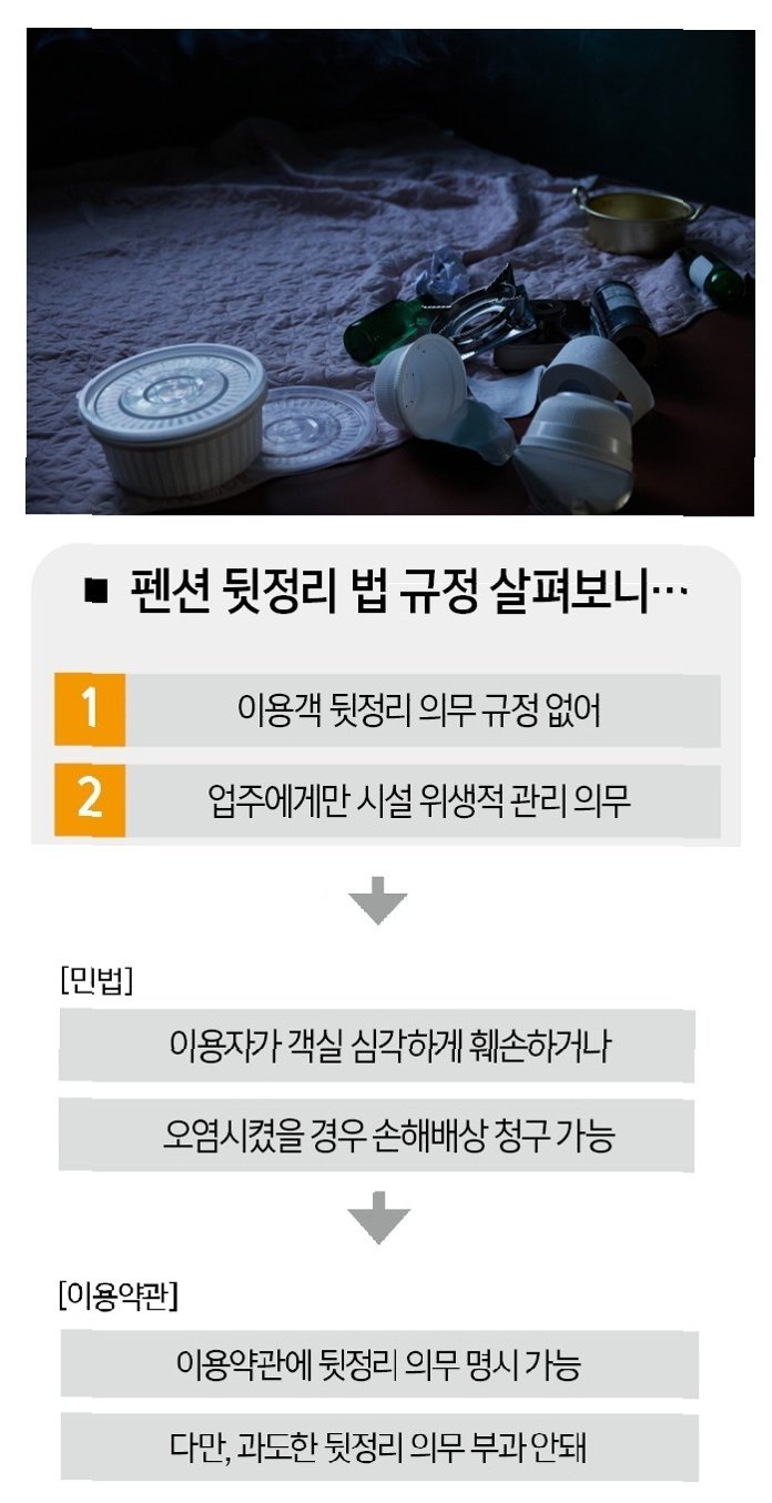 A.관련 법령에는 뒷정리를 의무화하는 규정이 없습니다. 하지만, 이용약관에 명시되어 있고, 투숙객이 이에 동의했다면 계약상 의무로 이행해야 할 수 있습니다.