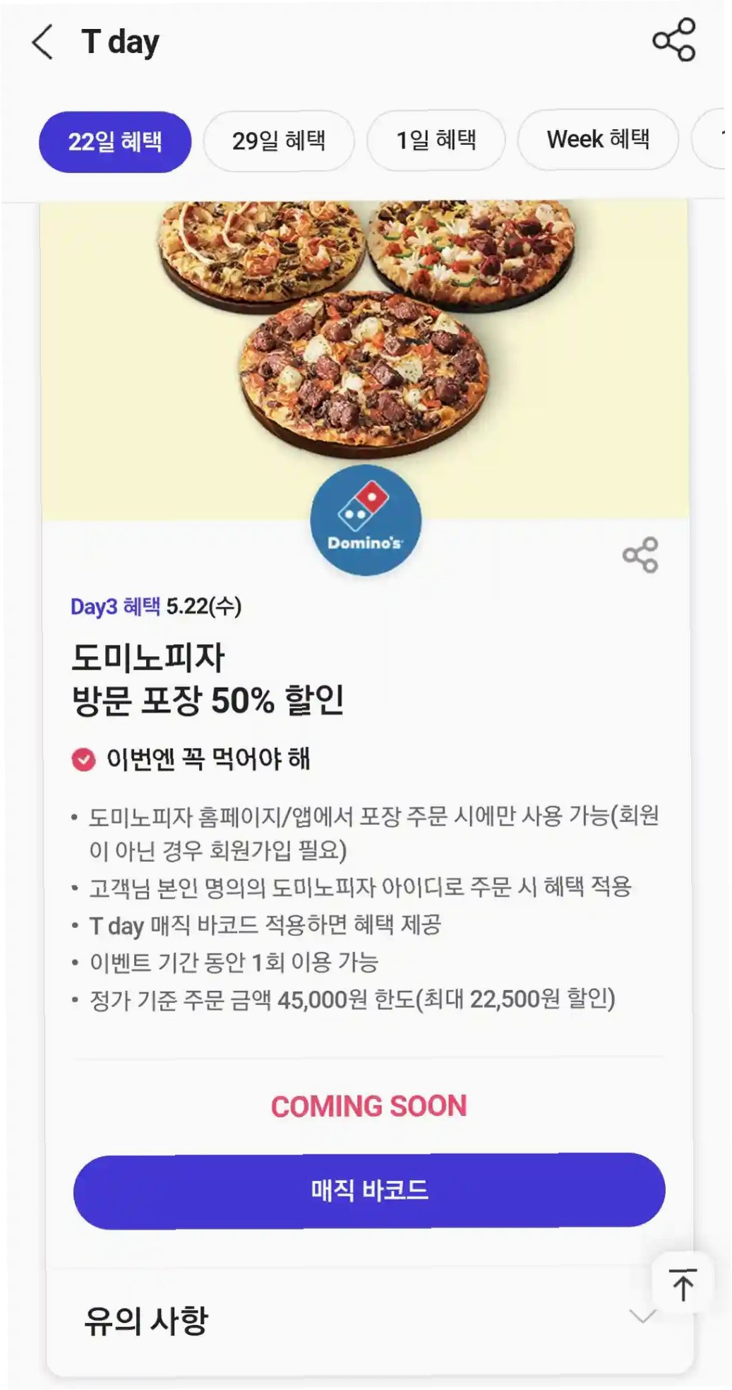 특히 도미노피자는 50~60% 할인 혜택이 제공된 첫 주말인 23~24일, 홈페이지와 앱 접속 지연이 반복되는 어려움을 겪었습니다. 도미노피자 홈페이지와 앱에서만 할인 쿠폰을 사용할 수 있다는 점이 접속 마비를 더욱 심화시킨 것으로 보입니다. SNS에서는 '도미노피자 대란'이라는 해시태그와 함께, '앱에서 선택하는 메뉴마다 재료 소진이라고 나온다'는 등의 불만이 쏟아졌습니다. SKT는 다음 달 4일까지 도미노피자 배달 50%(최대 2만5000원) 할인 또는 포장 60%(최대 3만원) 할인을 제공하며, 이러한 혜택은 소비자들의 관심과 주문 폭주를 더욱 부추겼습니다.