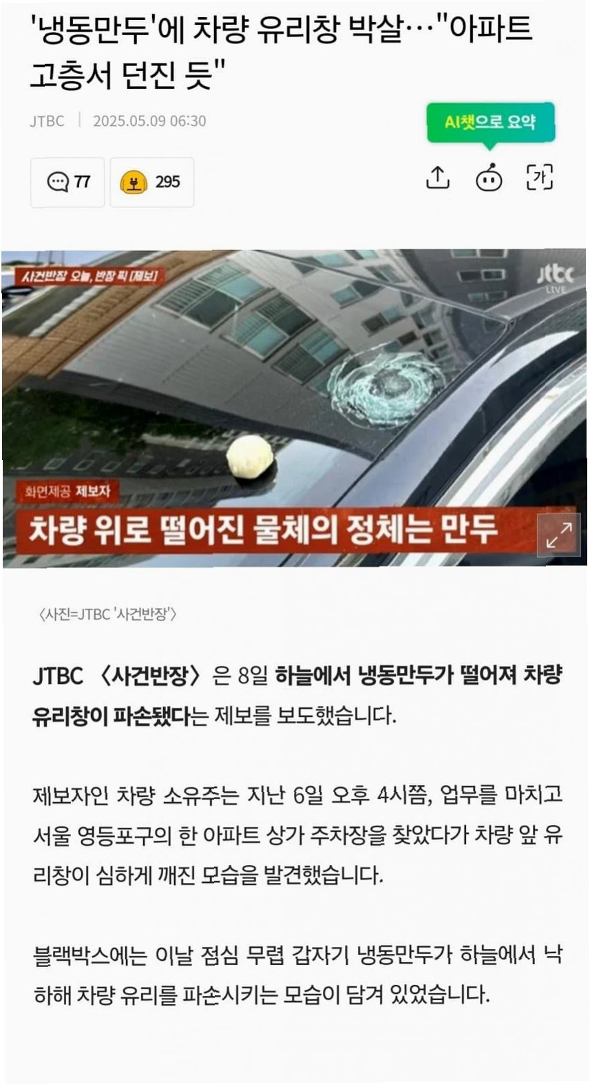 하늘에서 떨어진 냉동만두로 인한 차량 유리 파손 사건은 단순한 사고가 아닌, 우리 모두에게 안전의 중요성을 일깨우는 사건입니다. 이러한 사건들이 반복되지 않도록 서로의 안전을 위해 경각심을 갖고 생활해야 할 것입니다.