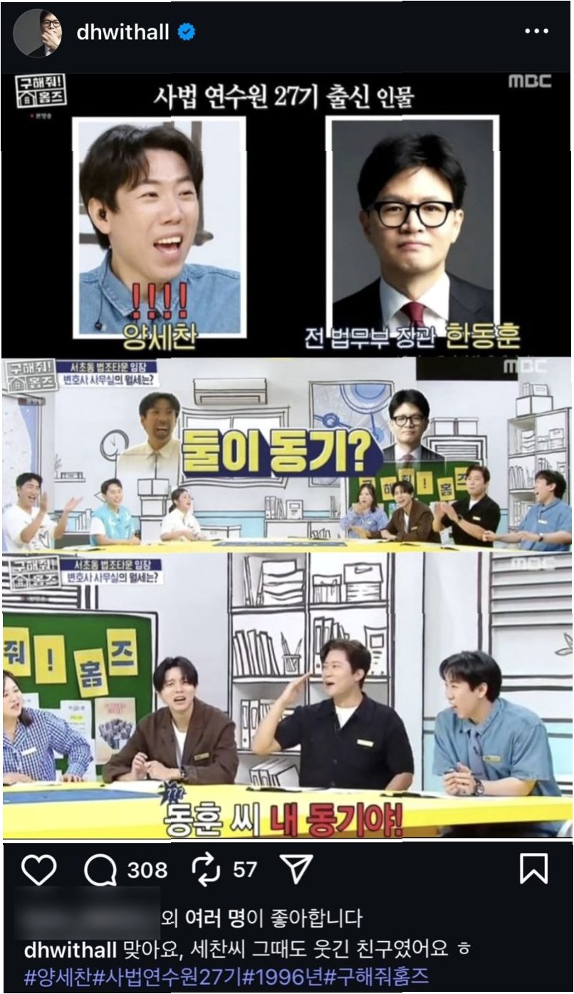 A.양세찬은 방송에서 한동훈 전 대표를 '사법연수원 동기'라고 언급하며 친분을 과시했습니다. 이에 한동훈 전 대표가 유쾌하게 응답하면서 화제가 되었습니다.