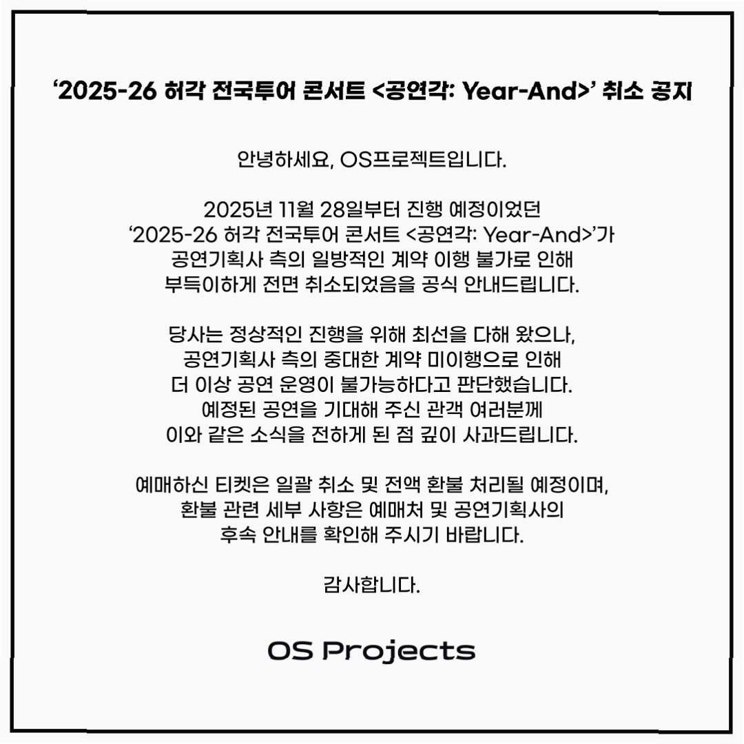 가수 허각의 전국투어 콘서트 '공연각: Year-And'가 일주일 앞두고 전격 취소되어 팬들에게 큰 충격을 안겨주고 있습니다. 2025년 11월 28일부터 시작될 예정이었던 이번 콘서트는 공연기획사 측의 일방적인 계약 불이행으로 인해 취소되었습니다. 팬들은 기대와 설렘으로 가득 찬 마음으로 공연을 기다렸지만, 갑작스러운 취소 소식에 깊은 실망감을 감추지 못하고 있습니다. 허각 소속사 OS프로젝트는 공식 입장을 통해 이러한 사실을 알리며, 팬들에게 사과의 말을 전했습니다.