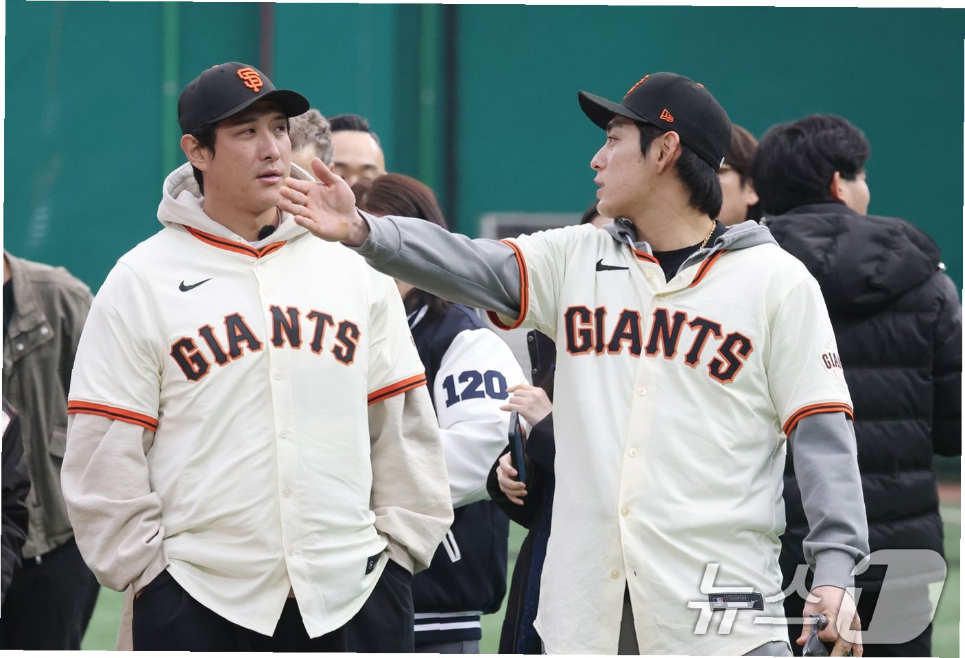 황재균(왼쪽)과 이정후가 7일 경기도 이천 LG챔피언스파크에서 열린 샌프란시스코 자이언츠 구단 주최 유소년 야구 클리닉에 참석했다.