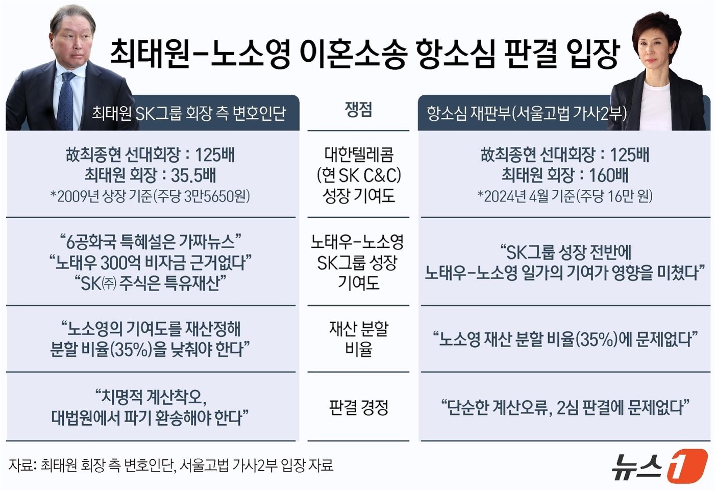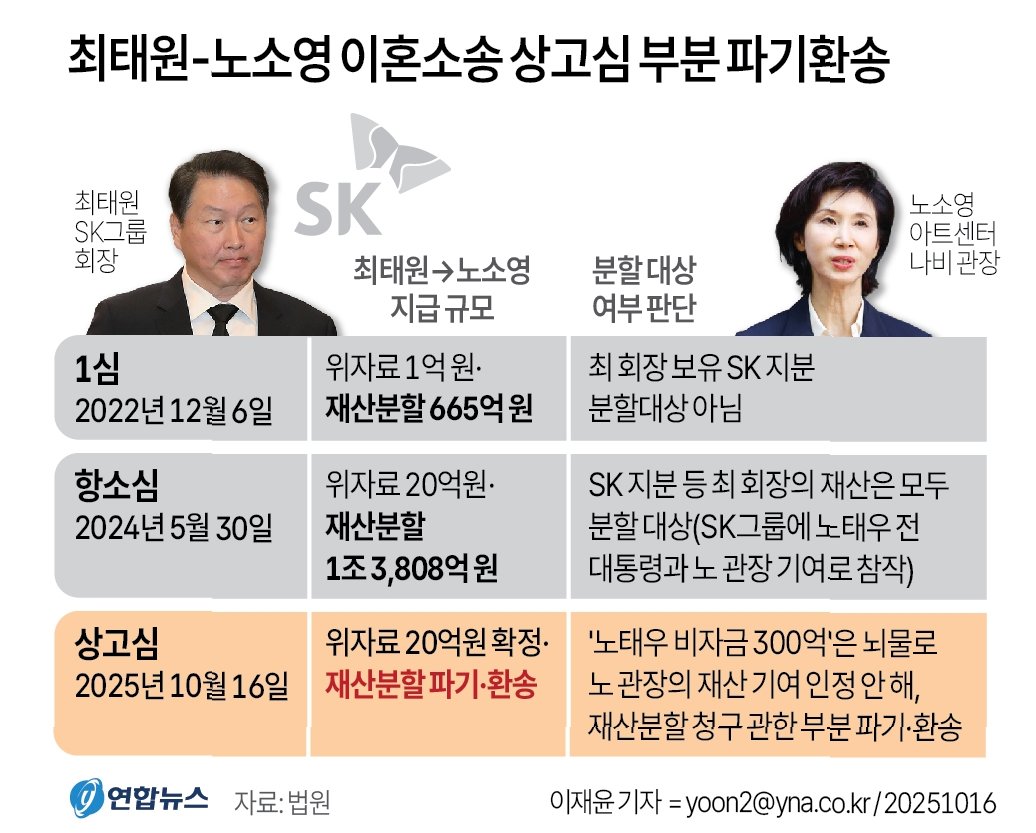 대법원이 최태원 SK그룹 회장과 노소영 아트센터 나비 관장의 이혼 소송에서 2심 판결을 파기하고 사건을 서울고법으로 돌려보냈습니다. 2심에서 최 회장이 노 관장에게 1조 3808억원을 재산 분할하라고 판결했지만, 대법원은 SK 주식 등 재산 형성 과정에 노 관장의 기여도를 다시 따져야 한다고 판단했습니다. 이는 노태우 전 대통령의 비자금 관련 기여도를 인정하지 않은 것이 주요 원인입니다.