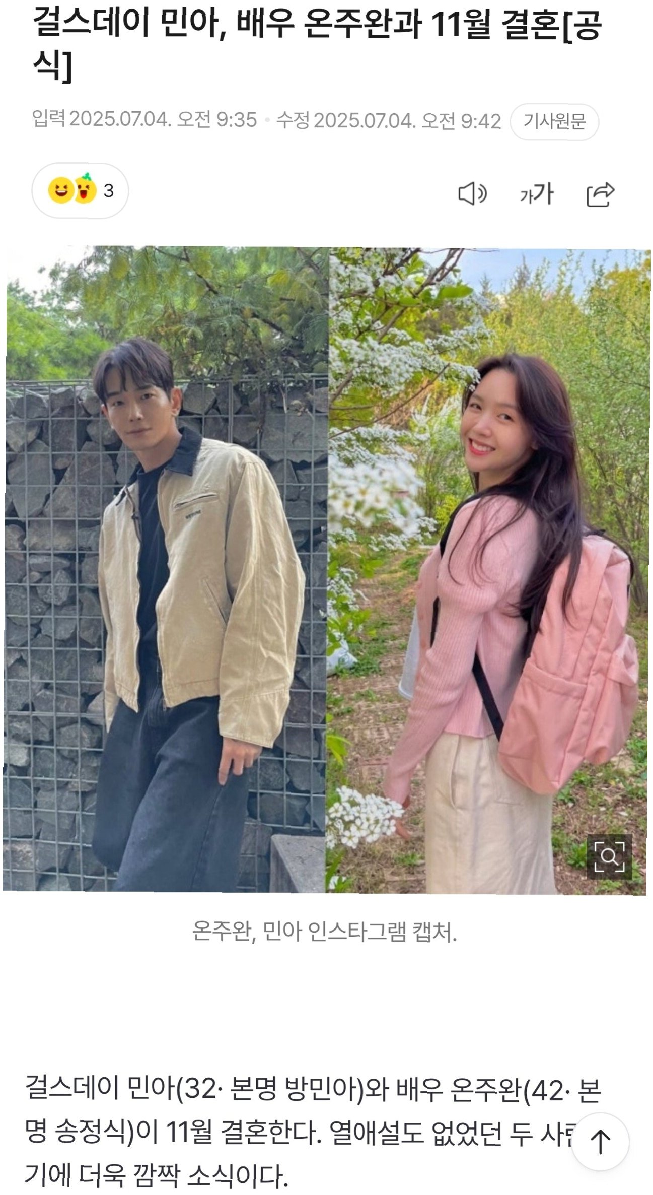 걸스데이 민아와 배우 온주완이 오는 11월 결혼을 발표하며 많은 이들의 축하를 받고 있습니다. 두 사람은 10년이라는 긴 시간 동안 연예계 선후배로, 때로는 든든한 조력자로 서로에게 힘이 되어주며 사랑을 키워왔습니다. 마침내 부부의 연을 맺게 된 두 사람에게 따뜻한 관심과 축하가 쏟아지고 있습니다.
