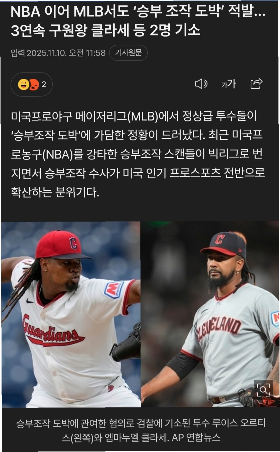 메이저리그(MLB)에서 활약하던 특급 마무리 투수가 승부조작 혐의로 기소되며 충격을 주고 있습니다. 미국 현지 매체 'ESPN'의 보도에 따르면, 클리블랜드 가디언스의 투수 엠마누엘 클라세와 루이스 오르티스가 사기 공모 및 뇌물 수수 혐의로 기소되었습니다. 이들은 스포츠 도박사들과 공모하여 투구 내용을 조작하고 그 대가로 금전을 수수한 혐의를 받고 있습니다.