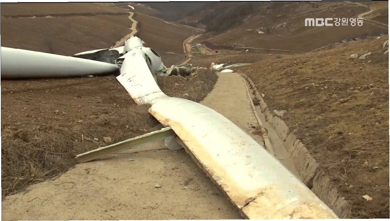 경북 영덕서 풍력발전기 엿가락처럼 부러져