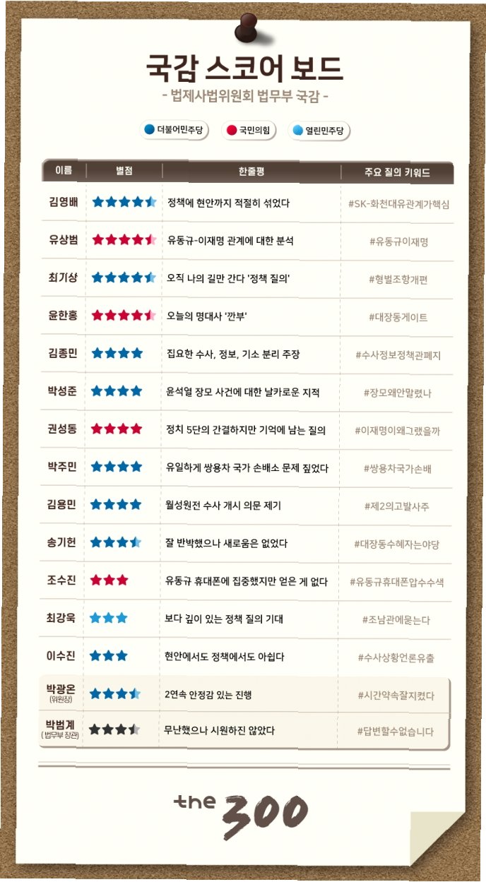 민주당은 조희대 대법원장 외에도 한덕수 전 국무총리와 지귀연 부장판사 등을 대법원 현장국감 증인으로 채택했습니다. 대법원 윤리감사관실의 감사결과 발표 뒤에도 ‘접대 의혹’이 사그라들지 않고 있는 지 판사에 대한 여권의 비판 공세가 예상됩니다. 더불어 검찰청 폐지 등이 담긴 정부조직법 개정에 검찰 내부에서 반발 기류가 나타나고 있는 점도 올해 법사위 국감의 주요 공방거리가 될 전망입니다.