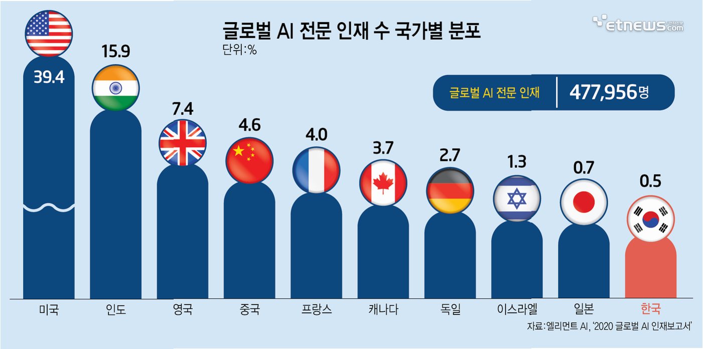 AI육성은 고사하고 한국은 AI인재 유출 국가로 지목된다. 스탠퍼드 AI인덱스에 따르면 한국은 AI인재 유출이 세계 다섯 번째로 심각한 국가다. 스위스 IMD의 ‘세계 인재순위’를 보면 한국은 해외 고숙련 인재의 만족도에서 2023년 47위를 기록했다.