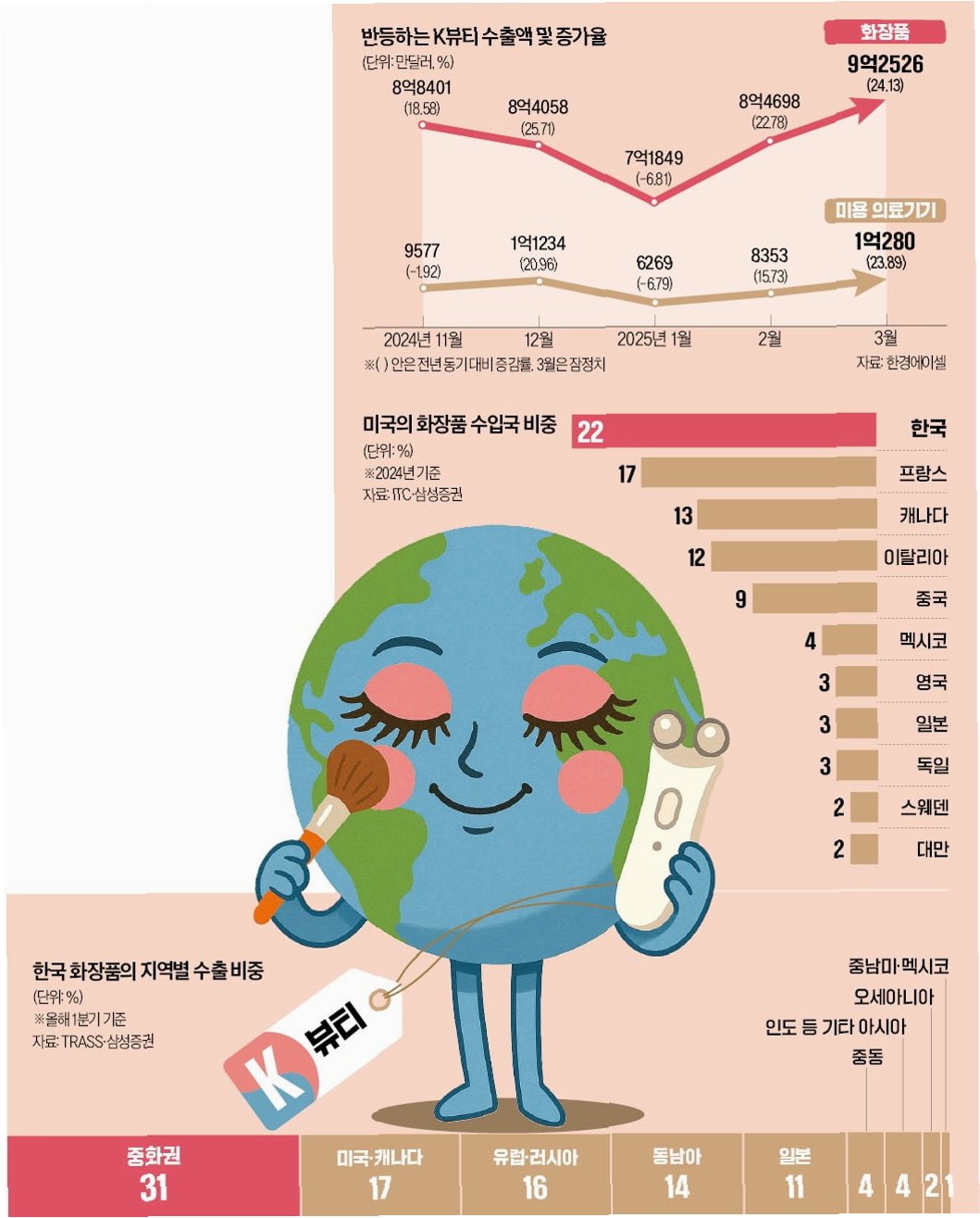K뷰티의 눈부신 성장세가 전 세계를 놀라게 하고 있습니다올해 한국의 화장품 수출액이 사상 처음으로 미국을 넘어섰다는 소식입니다이는 단순한 숫자의 변화를 넘어, K뷰티가 글로벌 뷰티 시장에서 확고한 입지를 다지고 있다는 것을 의미합니다. 지난해 한국은 이미 독일을 제치고 글로벌 수출액 순위 3위에 올랐으며, 현재 추세대로라면 프랑스에 이어 2대 뷰티 강국으로 도약할 가능성도 높습니다. K뷰티는 이제 단순한 유행을 넘어, 전 세계 여성들의 아름다움을 책임지는 핵심 트렌드로 자리 잡았습니다.