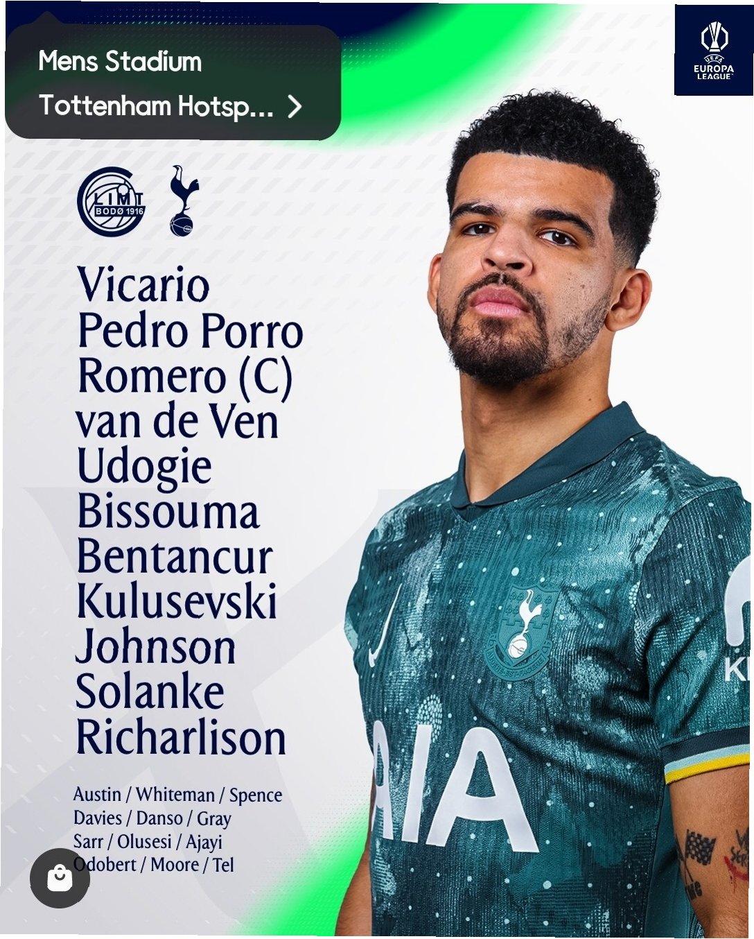 토트넘은 4-3-3 포메이션으로 경기에 나섰습니다. 히샬리송, 솔란케, 존슨이 최전방에서 공격을 이끌었고, 비수마, 벤탄쿠르, 쿨루셉스키가 중원을 장악했습니다. 보되/글림트 또한 4-3-3 포메이션을 선택했지만, 토트넘의 조직적인 수비에 막히며 공격에 어려움을 겪었습니다. 두 팀의 전술적 대결이 경기 내내 긴장감을 유지했습니다.