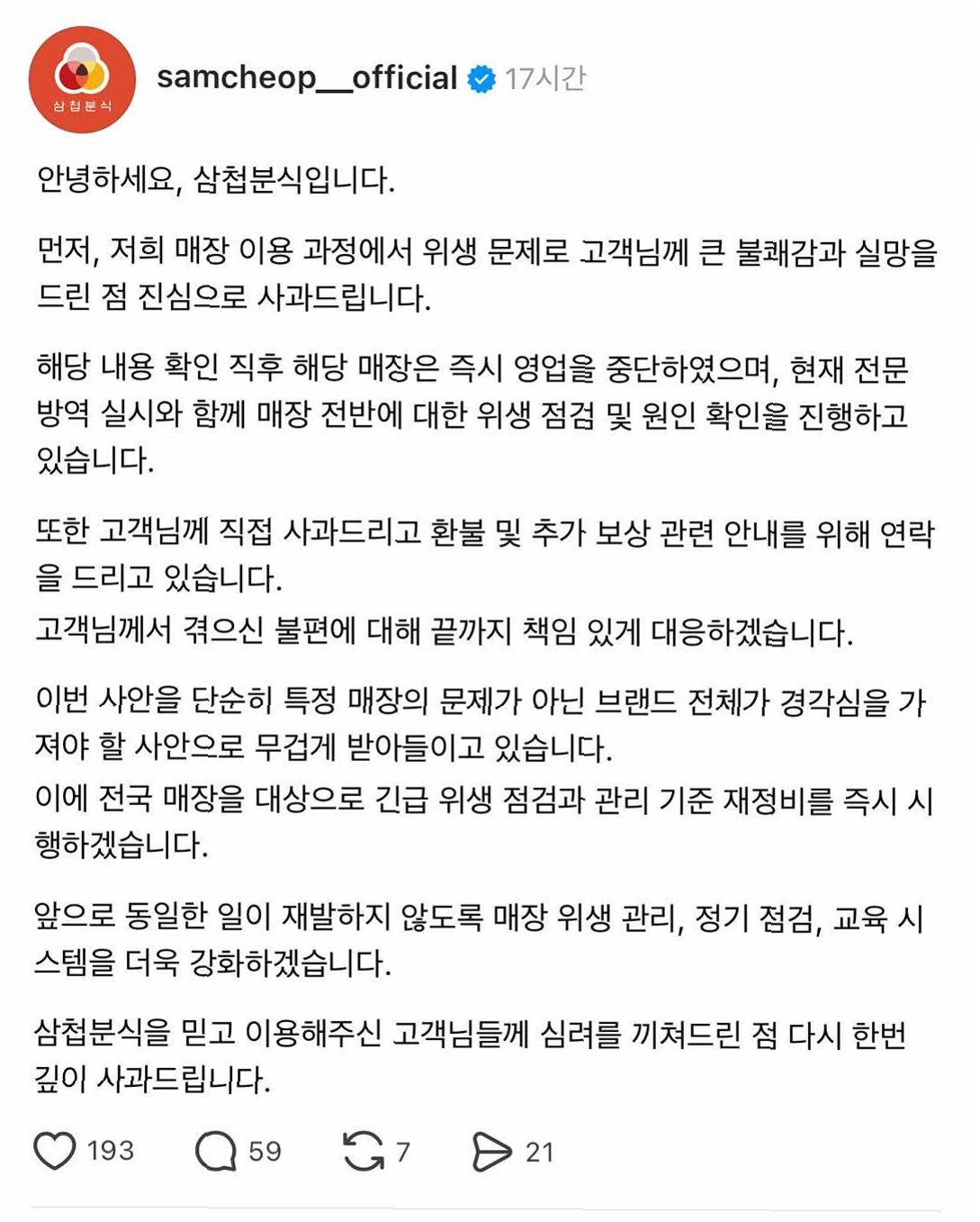 삼첩분식은 이번 사안을 특정 매장의 문제가 아닌 브랜드 전체의 경각심을 가져야 할 사안으로 받아들이고, 전국 매장을 대상으로 긴급 위생 점검과 관리 기준 재정비를 즉시 시행하겠다고 밝혔습니다. 앞으로 동일한 일이 재발하지 않도록 매장 위생 관리, 정기 점검, 교육 시스템을 더욱 강화할 것을 약속했습니다.