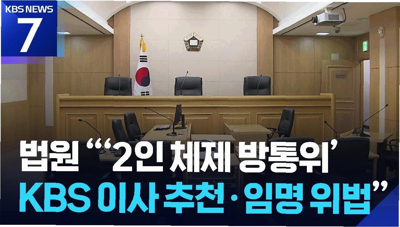 A.법원이 '2인 체제' 방통위의 KBS 이사 추천이 위법하다고 판결한 것입니다. 재판부는 정족수 미달을 이유로 2인 체제의 의결을 무효로 하고, 이후 대통령의 임명까지 위법하다고 판단했습니다.