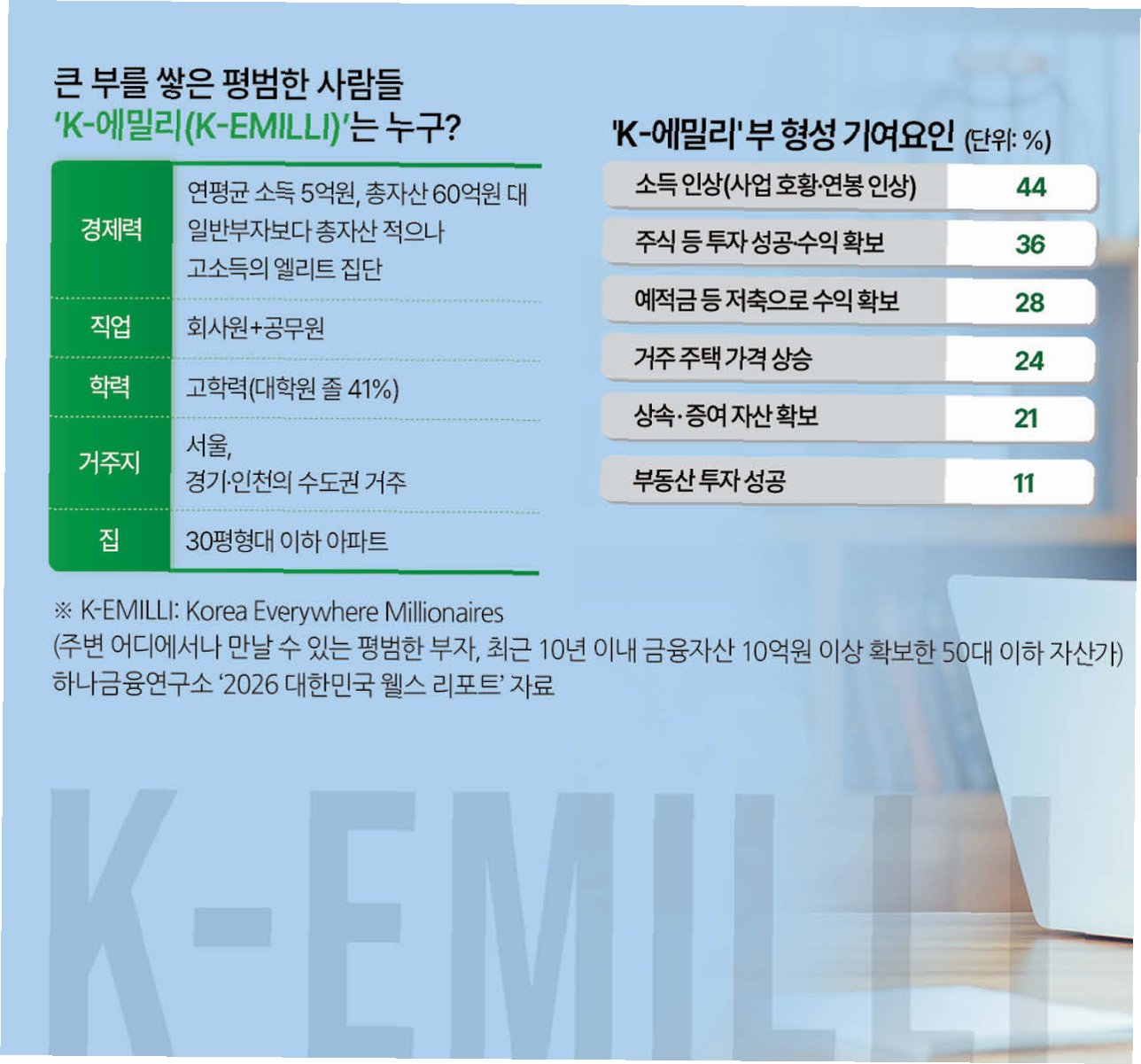최근 10년 안에 금융 자산 10억 원 이상을 모은 50대 이하 부자 중 30%가 회사원, 공무원 등 '샐러리맨' 출신으로 밝혀졌습니다. 하나금융연구소의 '2026 대한민국 웰스 리포트'에 따르면, 이들은 'K-에밀리(K-EMILLI)'라 불리며 월급을 기반으로 꾸준한 저축과 적극적인 금융 투자를 통해 자산을 증식시킨 것으로 나타났습니다. K-에밀리의 평균 연령은 51세이며, 상당수가 대학원 이상 학력을 보유하고 있습니다.