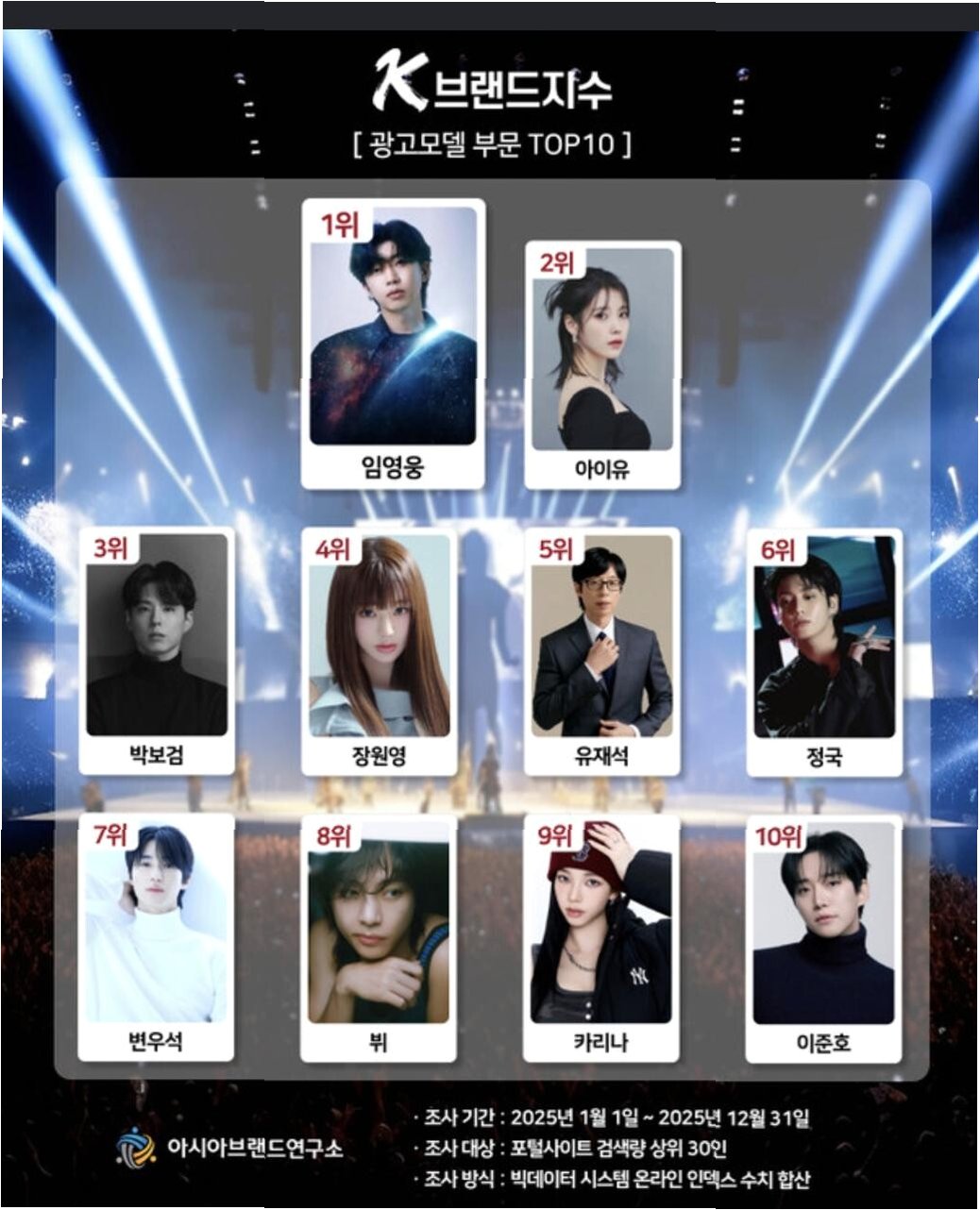 이번 광고모델 부문 평가는 포털사이트 검색량 상위 30인을 대상으로, 방대한 온라인 빅데이터 48억 건 이상을 분석하여 진행되었습니다. 임영웅은 이 치열한 경쟁 속에서 1위를 차지했으며, 아이유(2위), 박보검(3위), 장원영(4위), 유재석(5위) 등이 뒤를 이었습니다. 이는 임영웅이 전 세대를 아우르는 폭넓은 대중적 인기를 바탕으로 강력한 팬덤의 화력을 브랜드 가치에 효과적으로 반영시키고 있음을 보여줍니다.