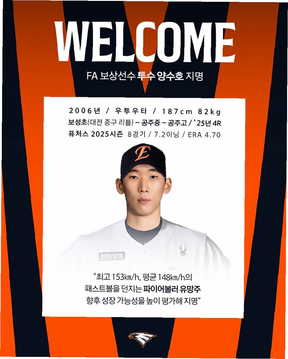 한화는 앞서 강백호의 보상선수로 한승혁을 내주고, 이태양은 2차 드래프트에서 KIA로 떠나면서 핵심 불펜 자원 세 명이 한꺼번에 이탈하는 상황에 놓였습니다. 이에 따라 불펜진 강화를 위해 젊은 투수 영입이 절실했습니다. 양수호는 2025년 신인 드래프트 4라운드 전체 35순위로 지명된 유망주로, 최고 153km의 직구 구속과 좋은 투구 임팩트를 자랑합니다.