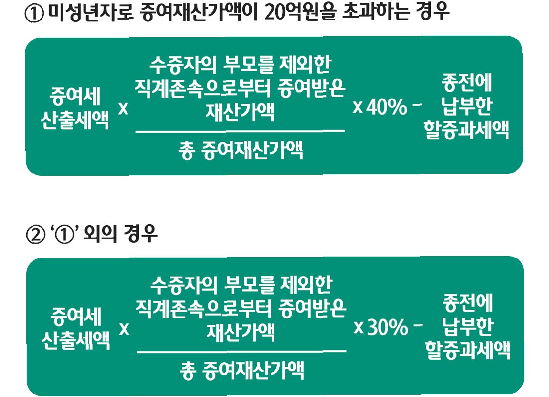 A.미성년자가 증여받은 재산의 가액이 20억 원을 초과하면 40%의 할증과세가 적용됩니다. 또한, 세대생략 증여의 경우 산출세액의 30%가 가산됩니다.