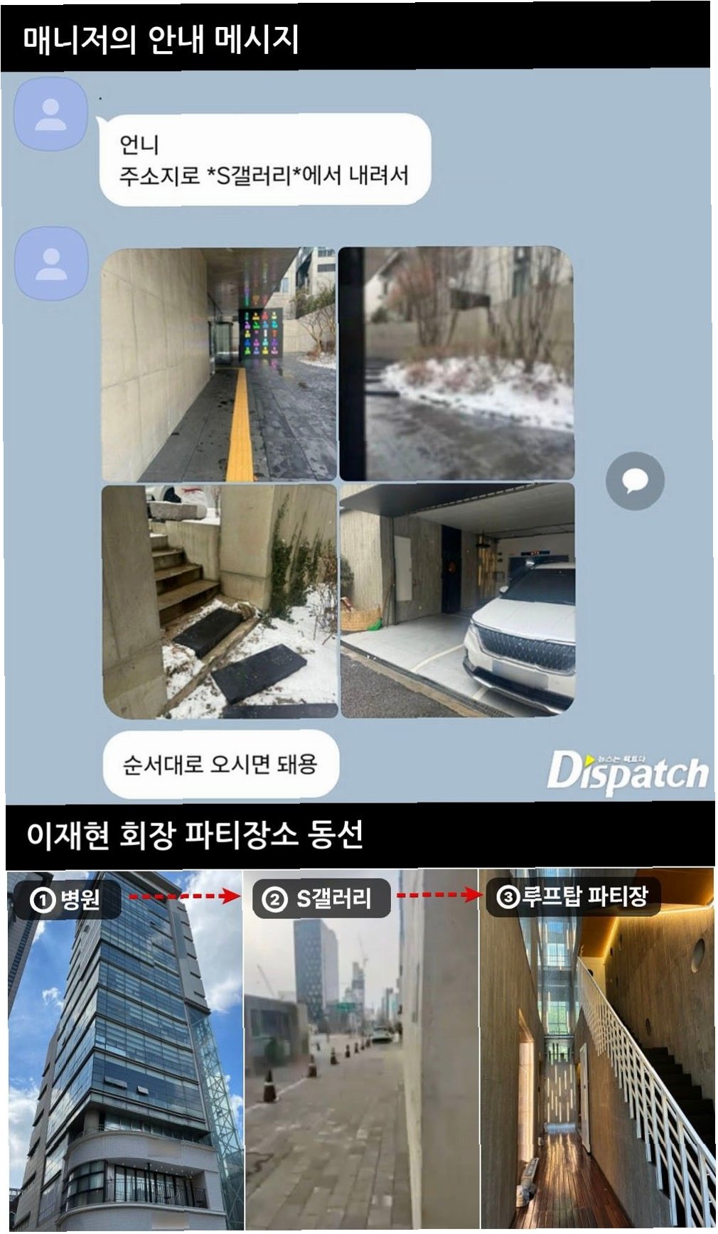 C씨에 따르면, 파티 도착까지 3번의 장소 이동이 있었다. 병원->S갤러리->파티장. 그리고 이동 과정은 철저히 보안 속에 이루어졌다. '디스패치'는 A씨의 문자와 C씨의 진술을 크로스 체크했다. 참고로, A씨와 C씨는 전혀 모르는 사이. 하지만 둘의 동선은 정확히 일치했다.