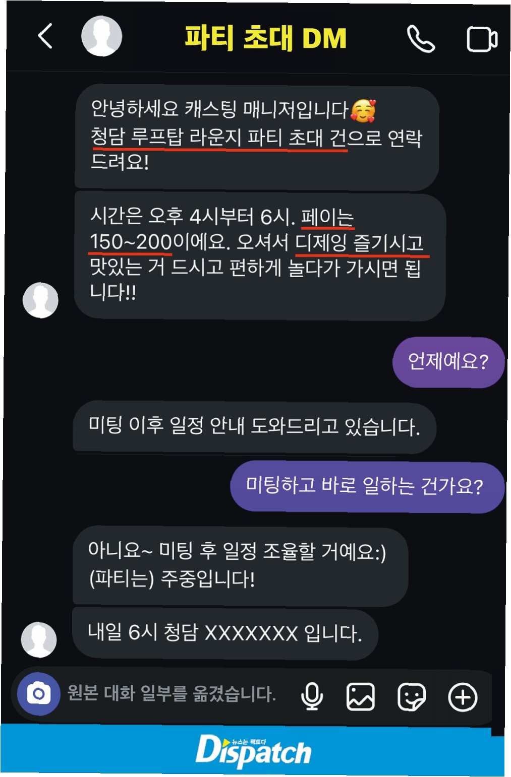 A씨가 받은 파티 초청 카톡이다. 먼저, 시간 (Time). 매니저: 저희가 주말까지 파티 인원을 체크해야 합니다. 못 오시나요? A씨: 아니요. 갈 수 있습니다. 그다음, 장소를 공지했다. 매니저: O월 O일. 도산대로 XXX, OO빌딩 1X층으로 와주세요. 마지막으로, 드레스 코드를 안내했다. A씨: 옷 스타일 추구하는 건요? 매니저: 거의 블랙 많이 입어요. 다리 예쁘면 검스 신으세요. 마르고 화려한 거 추구하세요. 매니저: 힐은 꼭 높은 것. 9cm 이상으로 신어주세요. 머리는 묶지 말고, 풀어서 와주시고요.